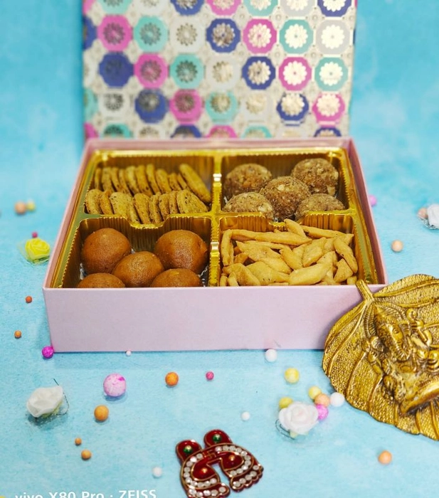 Family function or gifting. Our specially curated Bhaji hamper is all what you need. Beautiful box filled with delicious homemade sweet & savouries. A treat for the eyes & taste buds.