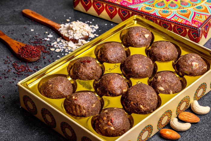 Our next laddoo which is very popular for its unique ingredients & taste, is RAGI & OATS LADDOO. The super grains are well known for its nutritional content. So we combined it with desi ghee, and mixed premium dryfruits, to make amazing sweet option, which is healthy too. Full of protein & calcium it is a must try. Absoulutely homemade at Sandeefoods & packed to perfection in our well crafted sweet box.